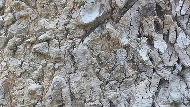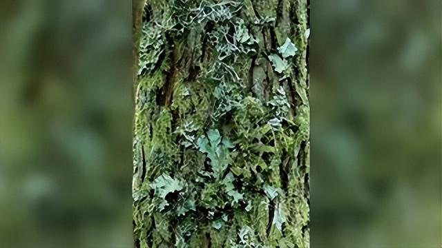在这张照片中,一只高高的变色龙隐藏在地衣和苔藓覆盖的树皮中。