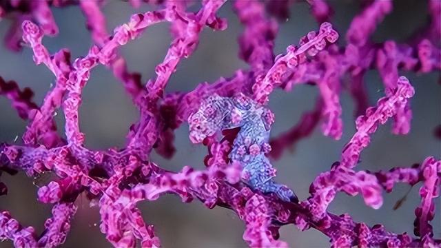 一只侏儒海马躲在色彩鲜艳的珊瑚中,它非常小,只有2 厘米长。
