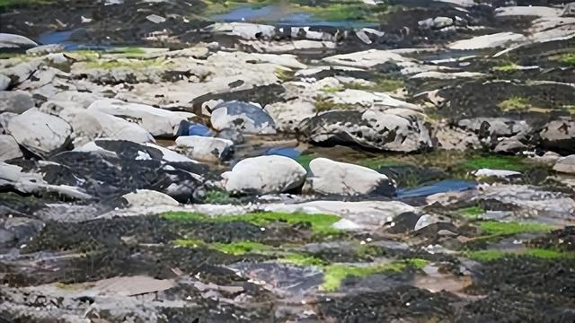 在这片岩石滩中,一只野鸭和三只小鸭完美地伪装在地形上,它们位于中心框架中两块大岩石的左侧。
