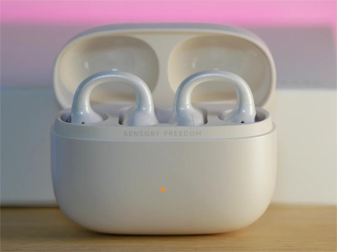 佩戴体验同样十分出色,单耳只有4.5 克的超轻重量,搭配前高后低的2.5 毫米错位设计,耳机戴上后自然形成前高后低的形态,能够更好地夹住耳朵,整体佩戴更加稳固。再加上∠12 度弧面耳托为耳朵提供合理支撑,紧贴耳背、受力均匀,就算佩戴一整天也不会有明显压迫感。