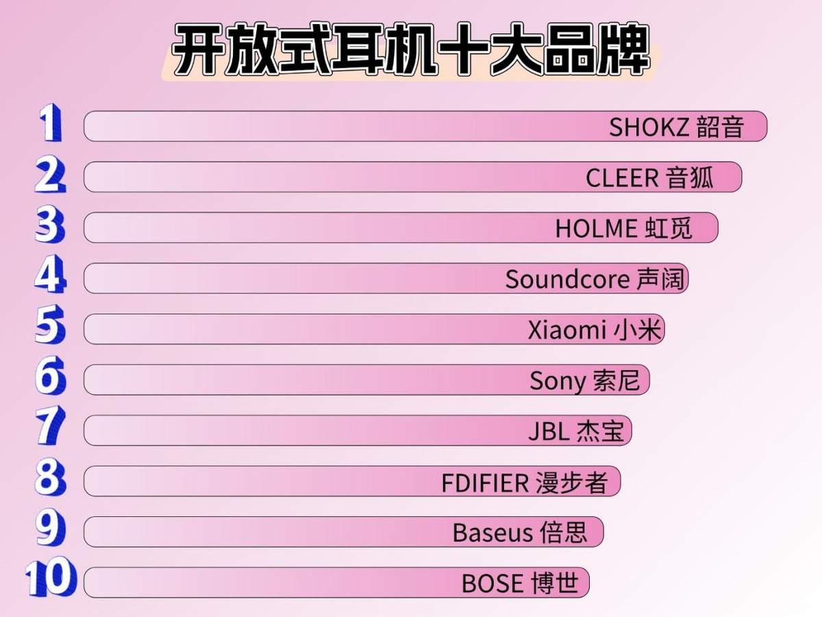 5.品牌:专业耳机品牌一般具备更为深厚的技术积淀,其研发团队会针对开放式耳机的声学结构、佩戴舒适度等核心问题开展专项研究。与普通品牌相比,它们更注重对产品细节的优化。此外,专业品牌在供应链管理方面更为严格,零部件采购标准更高,以此确保产品的耐用性。例如韶音、虹觅、漫步者等。