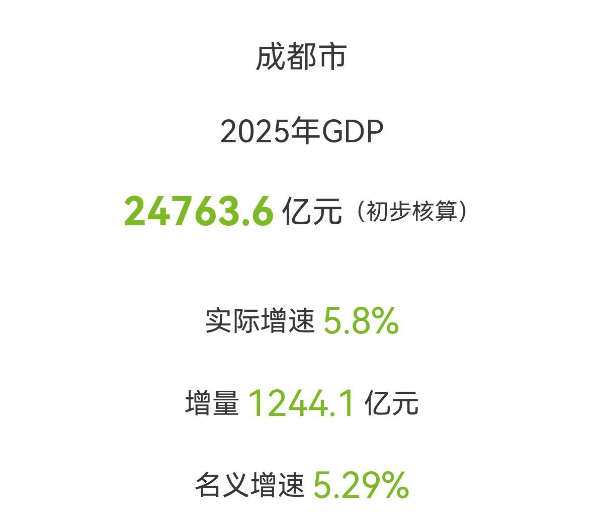 5.成都:GDP达24763.6亿元,同比增长5.8%,分别高于全省和全国0.2个百分点和0.8个百分点