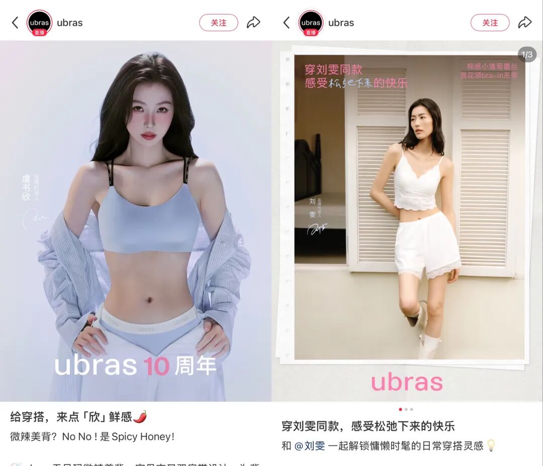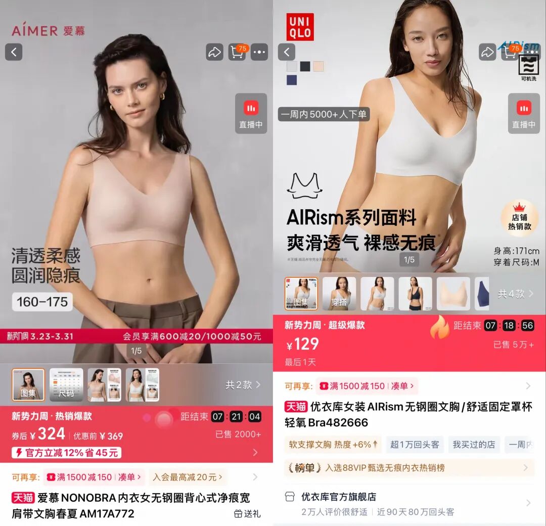 销售表现直观地反映了市场接受度。就天猫官方旗舰店近期的销售情况来看,截至发稿,爱慕“封面文胸系列”中销量最高的款式为交叉带款,已售300余件,部分其他款式销量在100件左右。而ubras的刘雯同款刺绣吊带内衣销量超过2万件,基础极简背心款销量也在8000件以上。