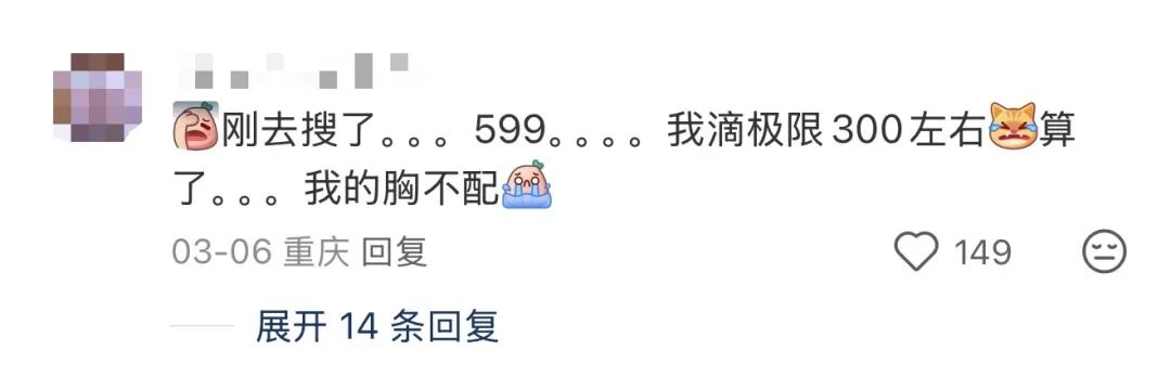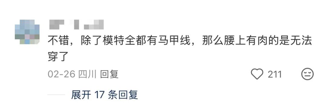 然而,在此次营销的声浪之外,社交媒体上也出现了一些不同的声音。在文淇的官宣评论区,一条高赞评论是:“除了模特全都有马甲线,腰上有肉的是无法穿了。”在另一条热门笔记下,热评第一是:“刚去搜了,599元,我的极限是300左右,我的胸不配。”