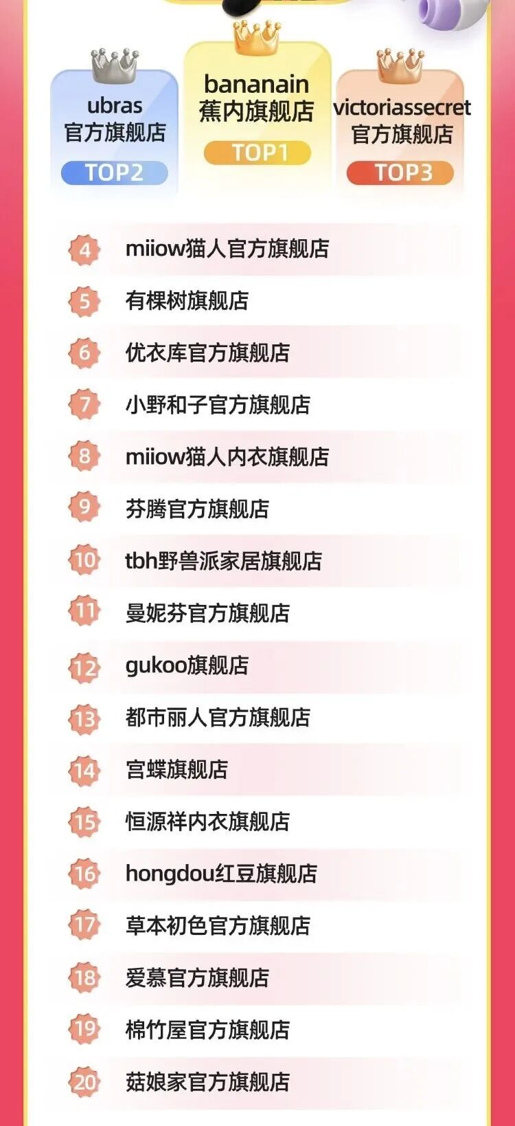 市场排名的变化更为直观。在2025年天猫“双11”内衣销售榜上,爱慕排在第18位。其身前不仅有以“无尺码”和极致舒适概念崛起的ubras、蕉内,以及国际品牌“维秘”,还有以高性价比著称的优衣库,凭借线上营销快速突围的有棵树、小野和子等新兴品牌。