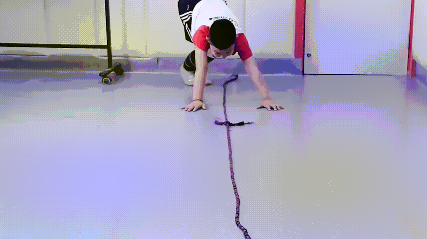 让孩子沿着地板缝隙或沿着一根跳绳,先用手支撑地面移动上半身,然后再移动腿部、向前迈步。