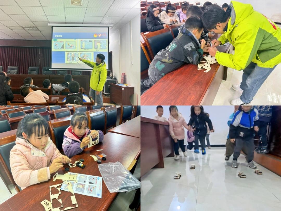 志愿者指导学生搭建小赛车并比赛课程还特别介绍了武汉理工大学WUT车队参与中国大学生方程式汽车大赛的经历,展示了车队在赛车设计、制造与竞赛中取得的优异成绩。车队成员不仅具备扎实的工程技术能力,也体现出团队协作与创新精神,为孩子们树立了良好的学习榜样。