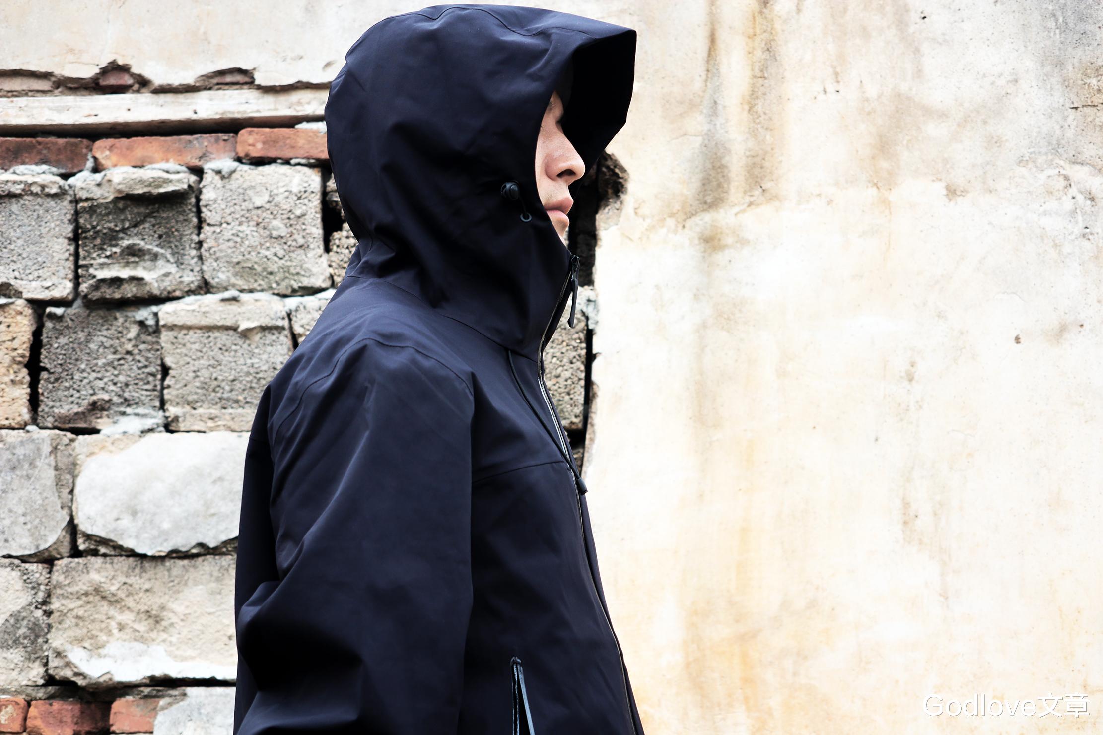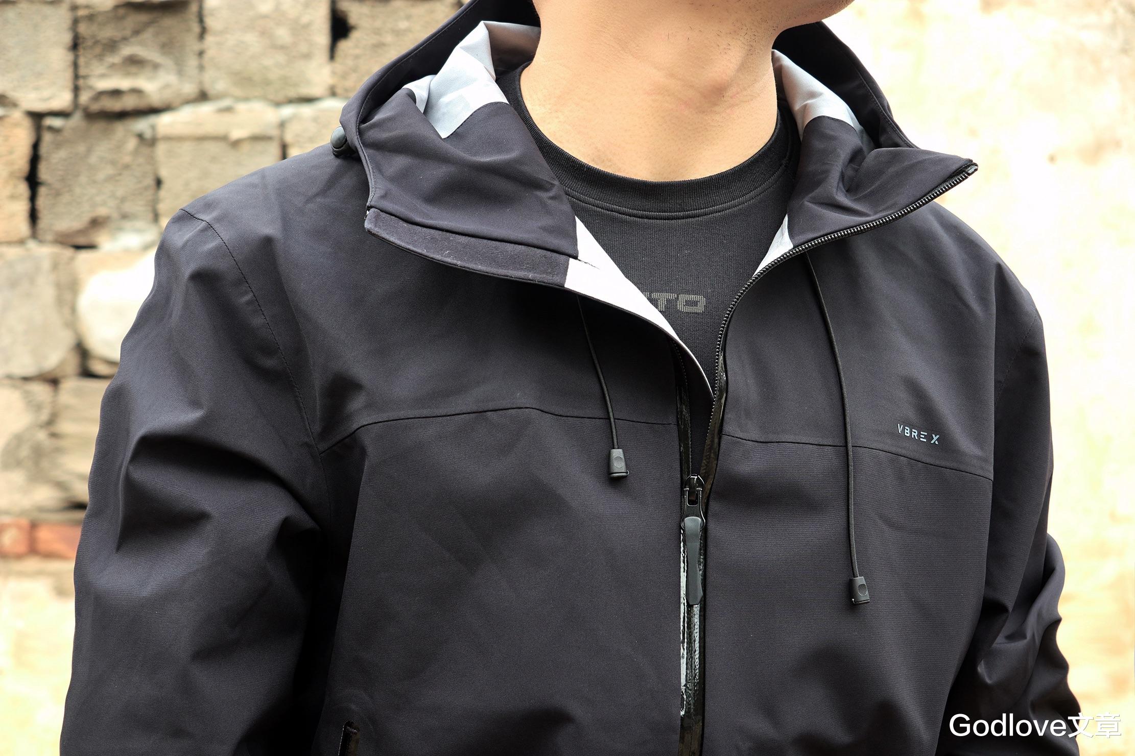 VBREX冲锋衣一体式带有帽子,不戴帽时风帽自然收贴后背摊领设计,戴帽状态下有3D 风帽调至贴合头型,抽绳收紧可包裹脸颊,头部、脖颈被完整防护,防风防雨防失温。
