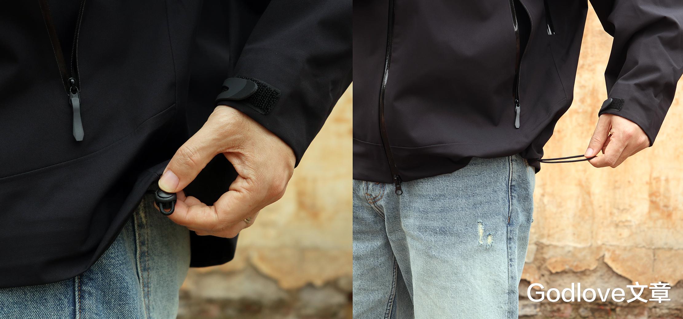 VBREX冲锋衣下摆内置隐藏式内抽绳设计,可快速收紧/放松,贴合腰部、不灌风、不往上跑。