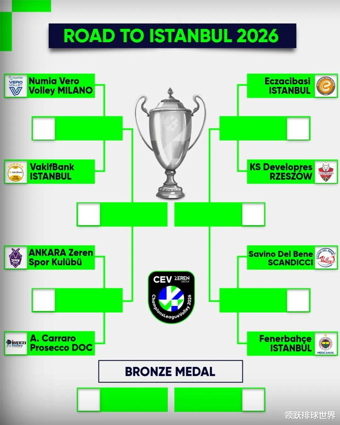随着这场意大利德比落幕,2025-2026赛季女排欧冠八强全部出炉,四支土耳其球队、三支意大利球队,以及一支波兰球队共同构成最终版图,朱婷加盟的科内利亚诺将对战欧冠的“金主”泽伦体育,具体对阵如下:瓦基弗银行vs米兰,科内利亚诺vs泽伦体育,伊萨奇巴希vs热舒夫,费内巴切vs斯坎迪奇。