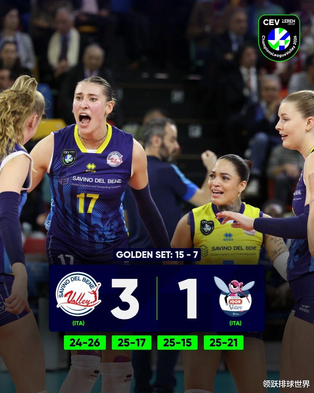 北京时间2月26日,佛罗伦萨见证了一场火花四溅的欧冠较量,2025-2026赛季女排欧冠八强附加赛第二回合,上演“意大利德比大战”,斯坎迪奇坐镇主场迎战诺瓦拉。首回合失利的斯坎迪奇背水一战,在先丢一局的不利局面下强势反弹,最终以3-1(24-26,25-17,25-15,25-21)逆转取胜,并在随后的金局中以15-7锁定胜利,成功晋级欧冠八强。