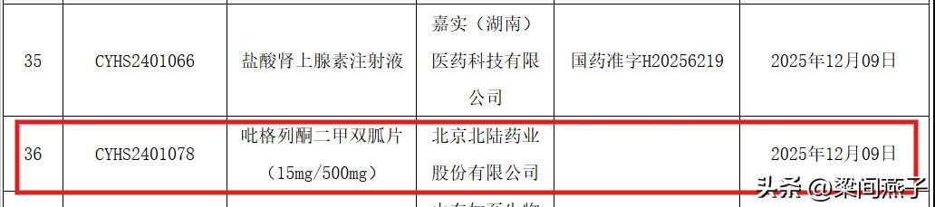 2025年12月11日,中国国家药品监督管理局批准了北京北陆药业股份有限公司的吡格列酮二甲双胍片(15mg/500mg)获批上市,视同过评。据公开资料显示,吡格列酮二甲双胍片是吡格列酮和二甲双胍组成的复方制剂,用于治疗2型糖尿病。获批适应症为在饮食和运动基础上,用于正在接受盐酸吡格列酮与盐酸二甲双胍联合治疗、或单用盐酸二甲双胍治疗后血糖控制不佳的2型糖尿病患者。