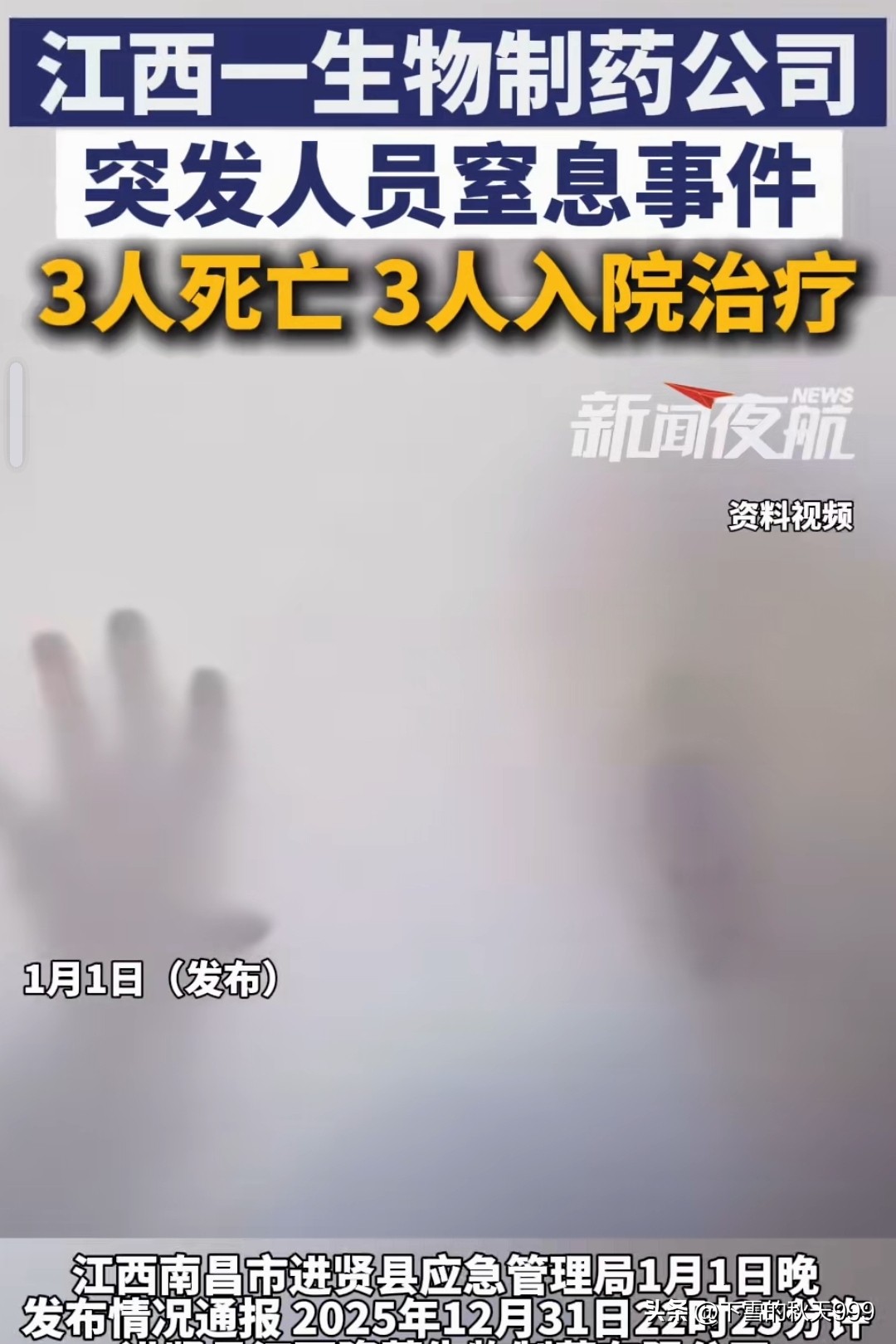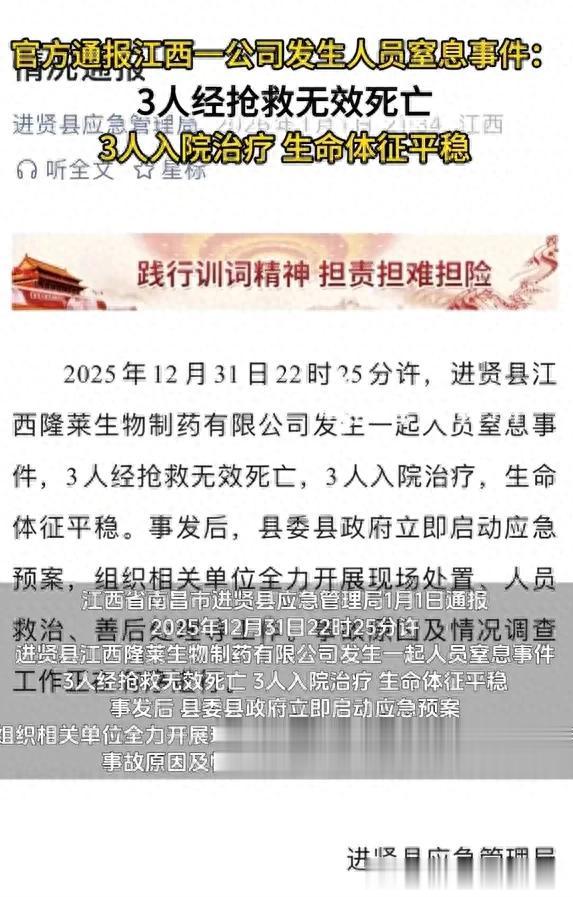 12月31日晚上22时25分左右,江西南昌进贤县的江西隆莱生物制药有限公司,突然发生了人员窒息事故,造成了3人死亡3人受伤的惨剧,3名工人的生命永远的停留在了这个跨年夜,让人看了十分的揪心。