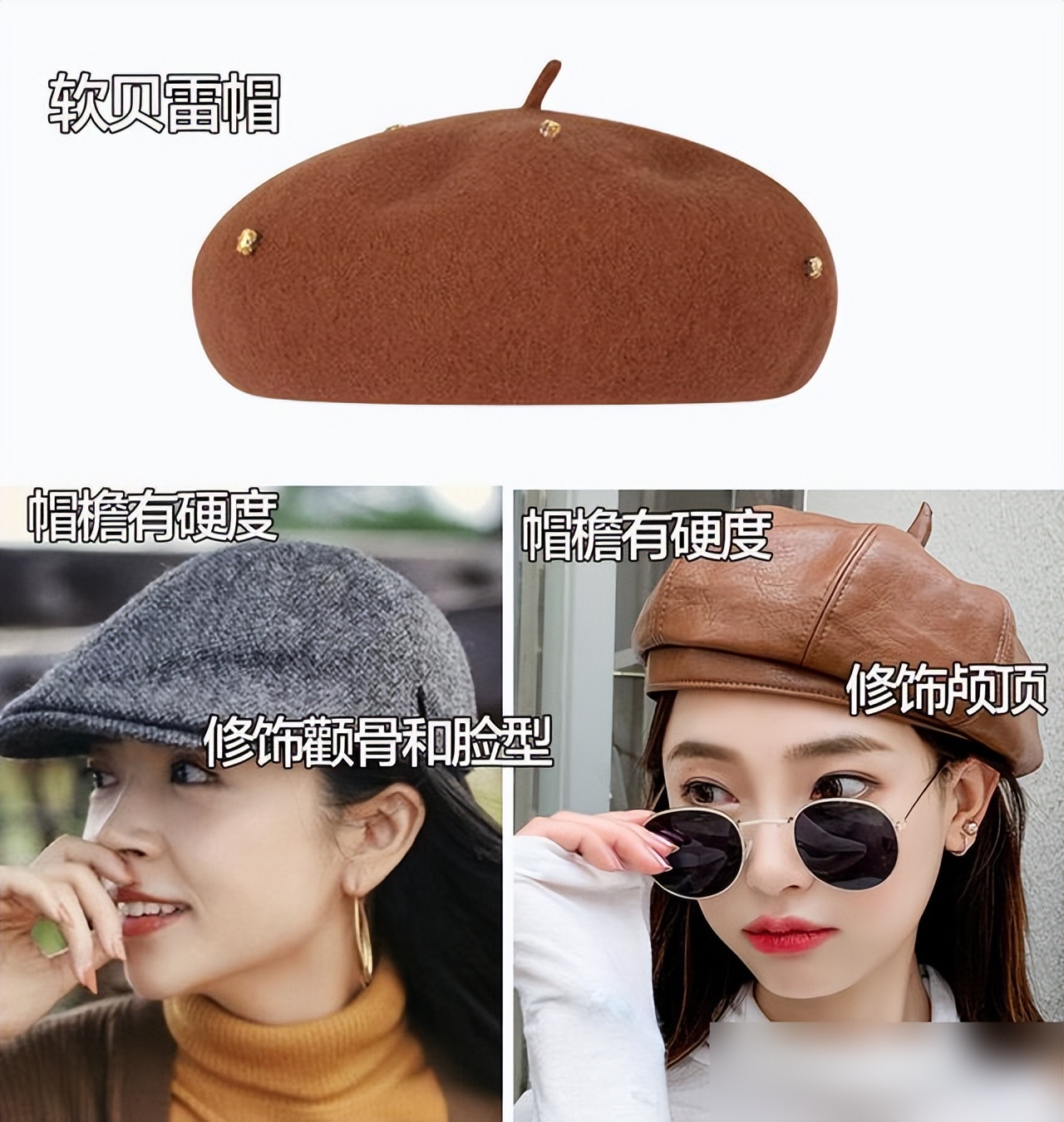 材质要硬挺点,皮革或粗呢面料最靠谱,软塌塌的毛呢戴上去没型,反而暴露脸型短板。