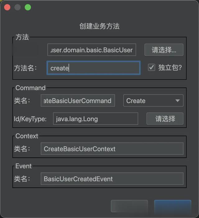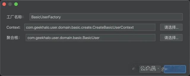 @Component@Slf4jpublic CreateBasicUserContextFactory extends AbstractSmartContextFactory<CreateBasicUserCommand, CreateBasicUserContext> { public CreateBasicUserContextFactory(){ super(CreateBasicUserCommand.class, CreateBasicUserContext.class); } @Override public CreateBasicUserContext create(CreateBasicUserCommand cmd) { CreateBasicUserContext context = CreateBasicUserContext.apply(cmd); return context; }}3.2.4.3. 聚合根工厂选择创建聚合根工厂,弹出以下弹窗: