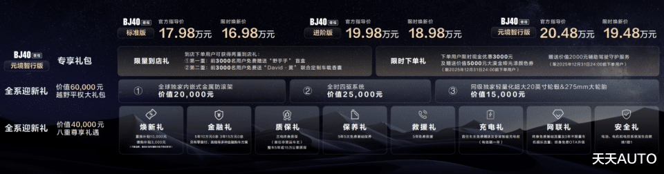 北京越野带来了元境智行版专享礼包:限量到店礼和限时下单礼。两项限量到店礼:前3000名用户,免费送“野乎乎”盲盒和北京越野与国际知名调香师David·黄联合定制的车载香囊。两项限时下单礼:第一项:从即刻起到年底下订用户,限时享现金优惠3000元;以及价值5000元的大漠金哑光漆颜色券。第二项:从即刻起到年底下定用户,限时赠送价值2000元的辅助驾驶守护服务。