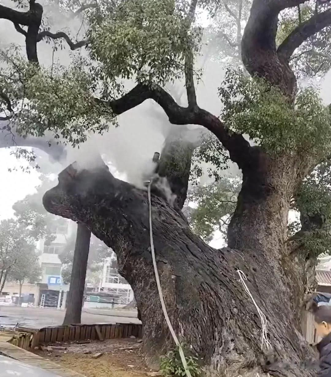 火情发生后,林业、消防、应急这些部门都赶过去了,全力灭火。可这古树太特殊了,树龄太久,树干和粗枝都是空心弯曲的,里面油脂又多,火点藏得特别深,还特别分散,好不容易把明火灭了,又好几次复燃,大家伙儿整整忙活了7个小时,才彻底把火扑灭,真是太不容易了。