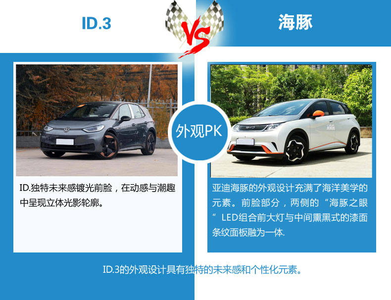 ID.3和比亚迪海豚的外观设计各有特点。ID.3的外观设计具有独特的未来感和个性化元素。前脸处,ID.独特未来感镀光前脸,在动感与潮趣中呈现立体光影轮廓。保险杠外围采用独特的浮雕式设计,光束粒子状的凹点纹理沿着下保轮廓呈参数化的排布方式,增加前脸视觉多样性并带来灵动的美感。