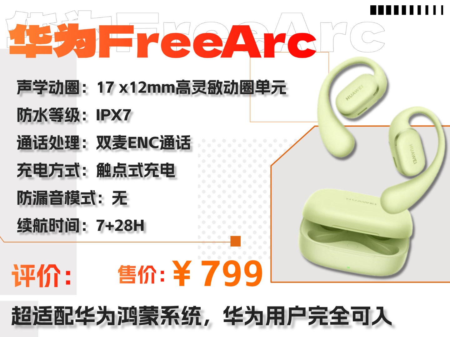 华为 FreeArc售价:799元推荐度:★★★★推荐理由:华为用户闭眼冲,连接顺、戴得稳,日常用着特顺手。