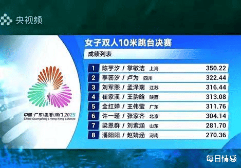 11月6日,第15届全运会女子双人10米跳台决赛尘埃落定,奥运三金得主全红婵跟搭档王伟莹一起,最终处于第五名的位次,没能登上领奖台,可是,由陈芋汐与掌敏洁组合而成的这一组,取得了优异的成果 。