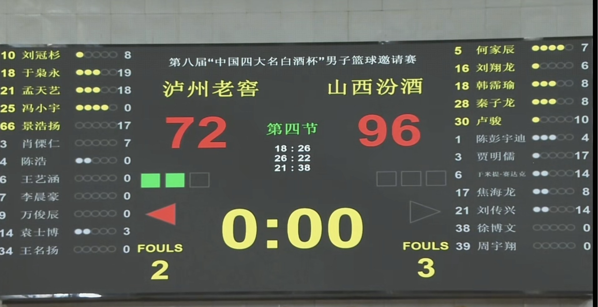 比赛进行到第四节末端,卢骏三分投进,韩霈瑜三分也有,刘冠杉扣篮,何家辰三分打进。72比96。