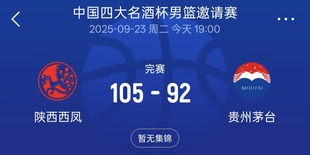本场比赛之前,首先开赛的陕西西凤酒队(青岛男篮)105比92战胜了贵州茅台队(广东男篮)!徐杰、焦泊乔、王少杰、张文逸出战。西风酒队净赢贵州茅台队13分。