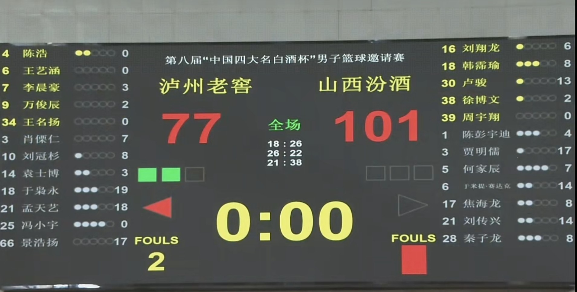泸州老窖队叫停回来,卢骏三分再中。72比99!刘翔龙盖帽,刘翔龙运球在紧迫之下走步,山西汾酒打进2分,得分破百!全场比赛结束,泸州老窖77比101山西汾酒男篮。山西汾酒男篮净赢泸州老窖队24分!