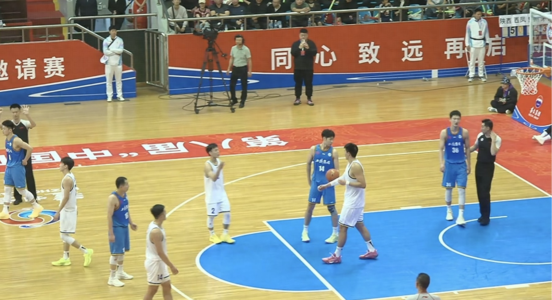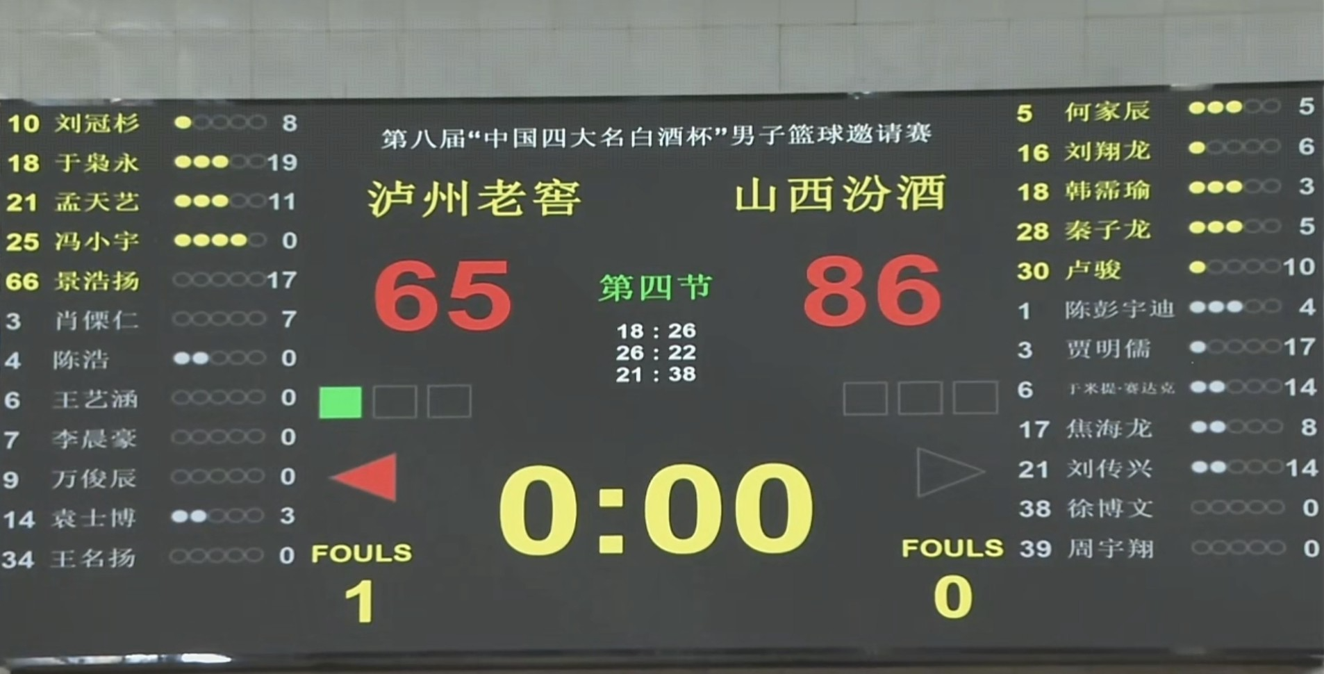 比赛进行到第四节前半节,山西汾酒男篮已经以86比65领先了对手21分。