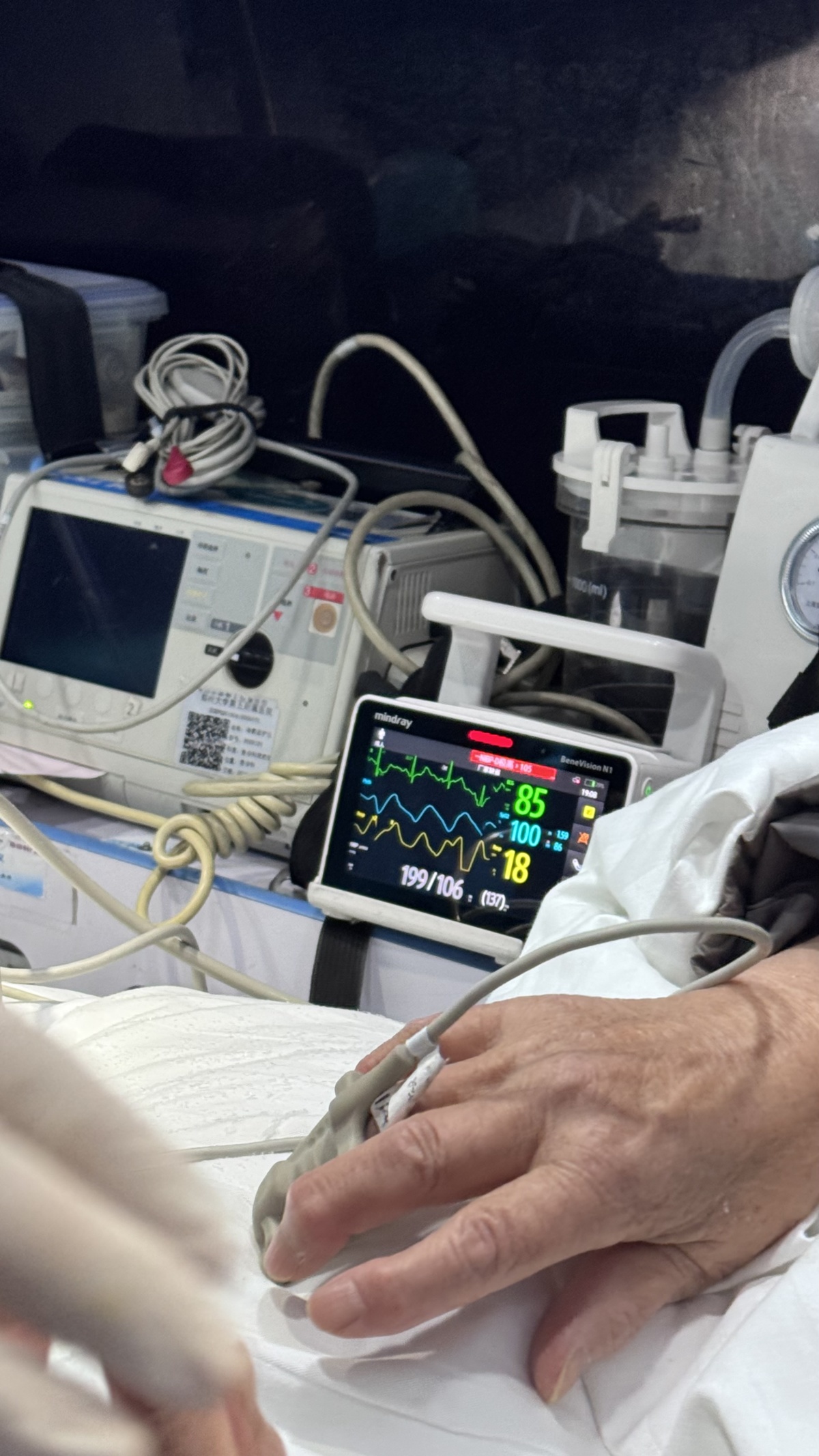 抵达患者所在小区后,急救团队带着心电监护等设备快步上楼。经检查,老人血压已高达200/106毫米汞柱,属于高血压急症诱发的呕吐。