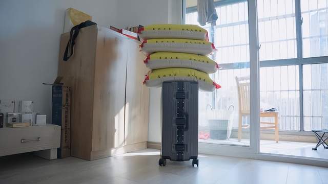 说实话,我当时心里也打鼓,怕给箱子踩坏了。结果呢?箱子沉都没有沉,什么印子都没留,之后我又抱了四袋50斤大米坐了上去,200斤,箱子依然没有出现下沉或者扁塌。