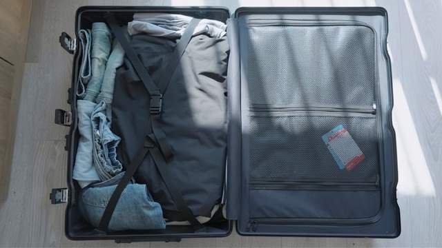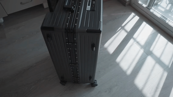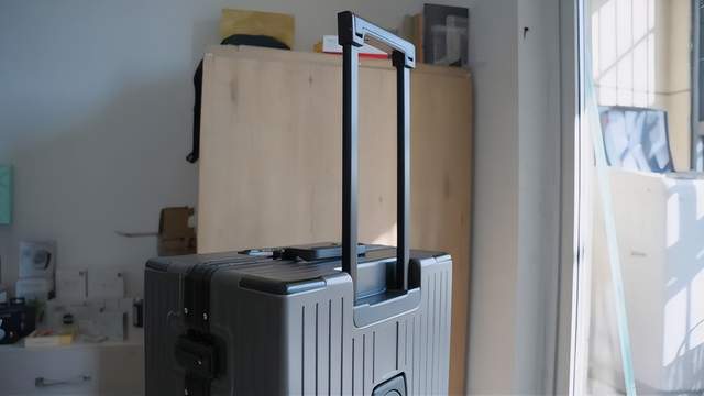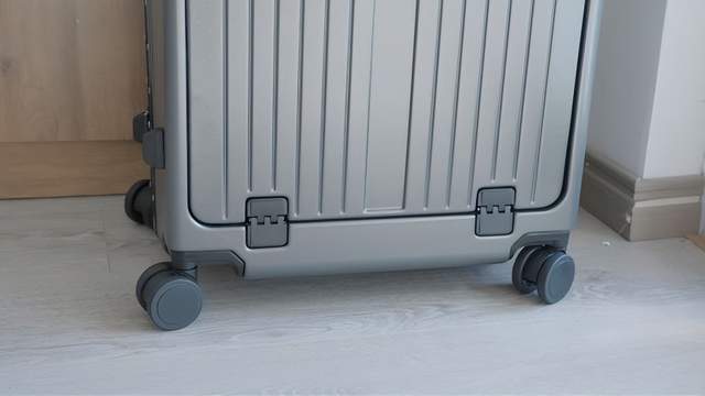 于是我模拟了几个日常最容易翻车的瞬间,第一个“失手跌落”,把装满衣服和重物的箱子,从 1 米左右的桌子上推下去。箱子落地声音很闷,没那种廉价塑料的清脆碎裂声。检查一圈,只有金属包角处有一点几乎看不见的划痕,轮子完全没形变。