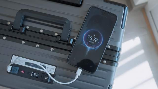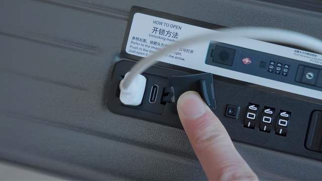 万一在赶路中手机上的电用完了,可以把箱子里的USB线插在笔记本或者充电宝上,然后再用随身携带的线连接行李箱上的USB口充电。