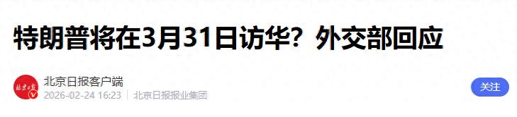 1.《特朗普将在3月31日访华?外交部回应》2026-02-24 16:23 | 来源:北京日报客户端