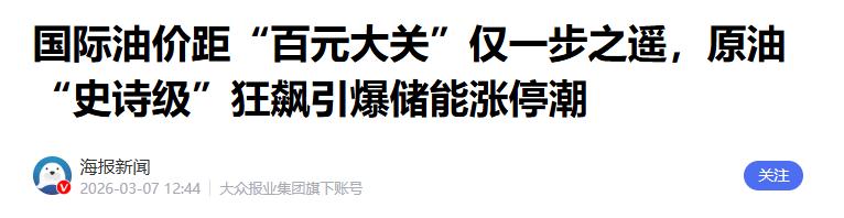 2.《国际油价距“百元大关”仅一步之遥,原油“史诗级”狂飙引爆储能涨停潮》2026-03-07 12:44 | 来源:海报新闻