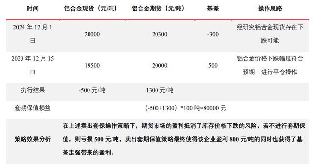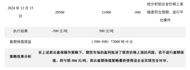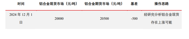 假设某铝合金生产企业每月计划销售铝合金 5000 吨左右,平均到每日大约为 200 吨左右。我们假设企业 2024 年 12 月 1 日企业当日决定销售 200 吨,并且当日已签订销售 合同 100 吨,且生产线上库存 100 吨,则当日现货多头敞口 100 吨。企业决定在期货 市场采取操作规避敞口,以保证企业生产利润。
