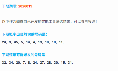 本期分析:本期的冷热分布,本期的遗漏大于9的号码有6个,上期的冷码开出了2个号码,温码开出了2个号码,上期热码开出了1个号码,本期的冷码并不多,考虑1个号码即可,热码近期并不是很活跃,本期也只需要考虑1到2个号码,温码是本期的重点,考虑2到3个号码。(热码:蝴蝶算法中概率前10的号码,只有10个;冷码:遗漏大于等于9的号码;温码:排除前2类之外的剩下的号码,都是温码;)