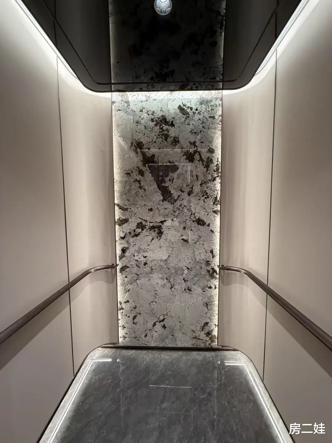 进入电梯后,我还挺惊讶的:这个楼盘竟然做得如此精致,电梯里面全部做了包边处理,墙面是皮质包边,正前方是岩板。