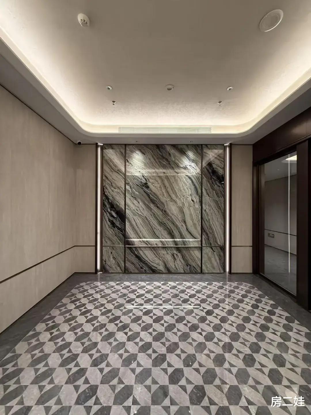 这是小区单元入户大堂的实景图。可以看到,地板是做了拼花设计的,正前方的墙面也是用的奢石打造。