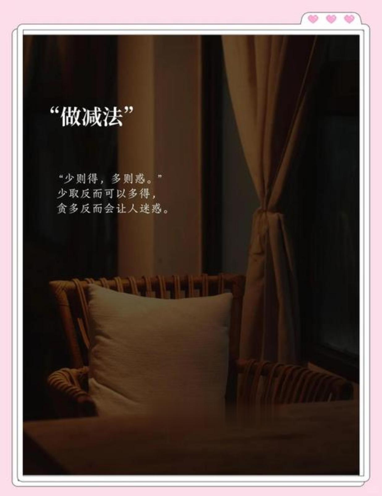 物质减法。把家里多年不穿的旧衣服不用的杂物,整理收拾打包,或捐或扔或卖。社交减法。把十几年不联系的人,把曾经让你堵心让你难堪让你讨厌的人等等无效社交,统统删减。欲望减法:把自己不切实际的幻想和奢望,把自己好高骛远想入非非的欲望全部删减掉。让自己整个人从物质到精神,从社交到灵魂都减的简简单单,干干净净,清清爽爽。