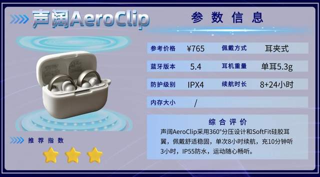 AeroClip单次续航8小时,总续航32小时,充电10分钟可用3小时,续航够日常通勤或短途运动使用。整体舒适度和佩戴贴合度不错,音质温和均衡,更偏向日常听音和轻运动场景,适合不追求重低音和极限运动的用户。