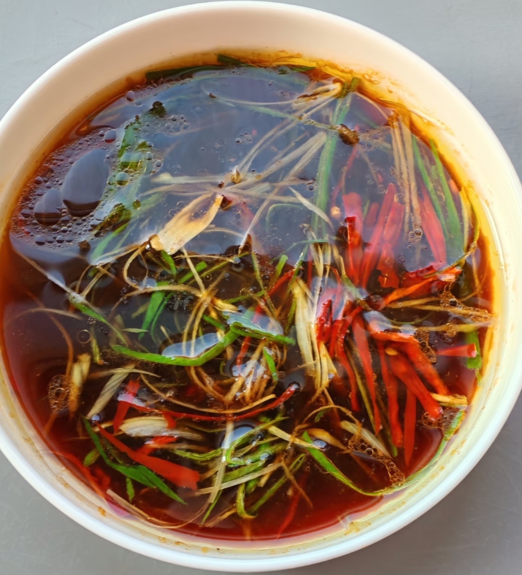 把熬好的基础料汁倒进刚激过热油的三丝里,轻轻搅拌均匀。这时候的料汁,色泽红亮、香气层次丰富,葱姜的辛香、红椒的甜香、酱油的醇香完美融合,简直是一碗液体黄金!
