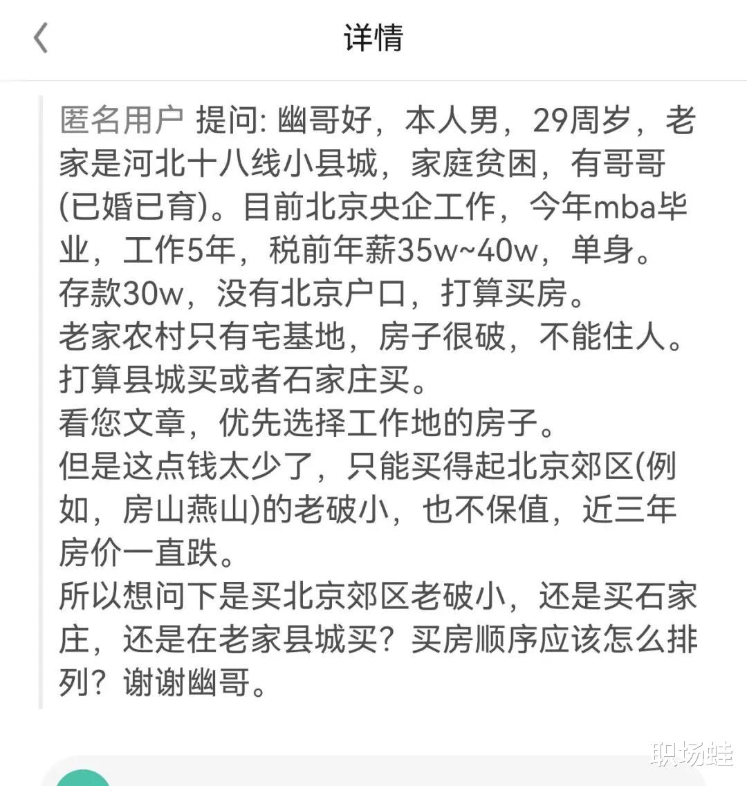 他主要问了买房问题。家里有哥哥,自然优先买北京的房子。再等个一年半载,还能再阴跌个10-20%,届时再下手,届时你的积蓄也会更多一点用来支付首付款,购房和贷款、利率等政策也会继续变好一点。