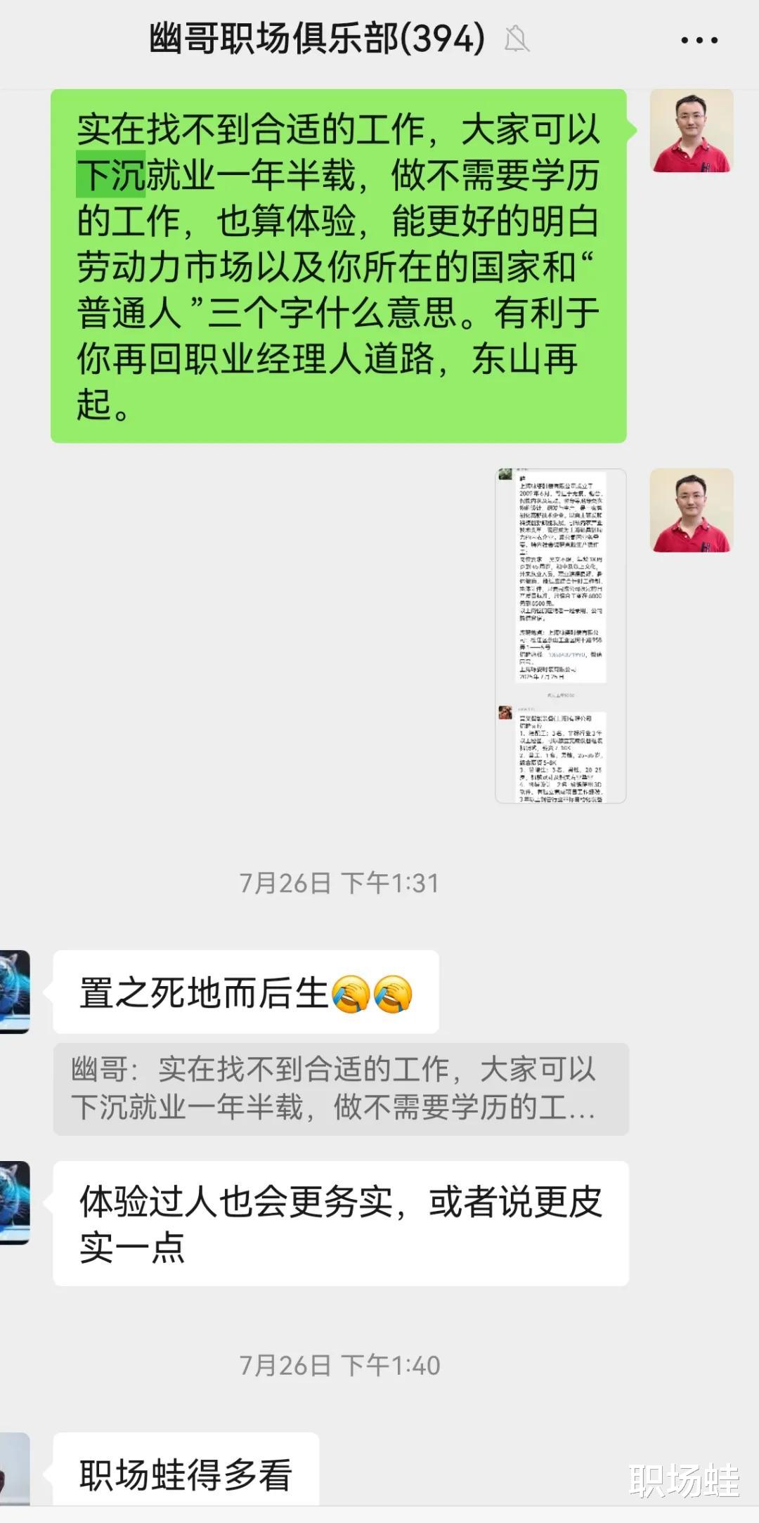 也不是反讽你,我群里就提醒过大家,确实可以在找不到合适的工作时,尤其你这样觉得体力活更让人快乐的人,当然可以下沉就业一年半载,做不需要学历的工作,也算体验,能更好地明白劳动力市场,包括理解你所在的国家、城市以及“普通人”三个字是什么意思。有利于你再回职业经理人道路,东山再起。