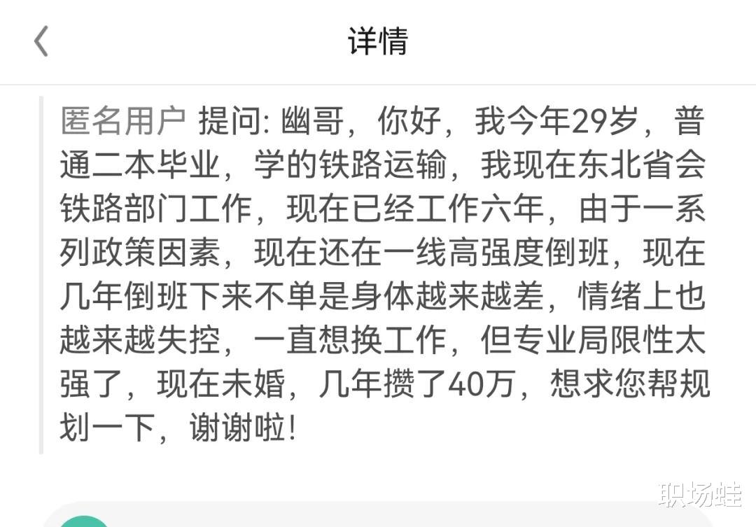 这位星友今年也29岁,普通二本毕业,学的铁路运输,现在东北某省会的铁路部门工作,需要倒班,还是蛮辛苦的,身体越来越差,情绪上也越来越失控。6年大致攒了40万,这是税后工资,算每年余下来7万。