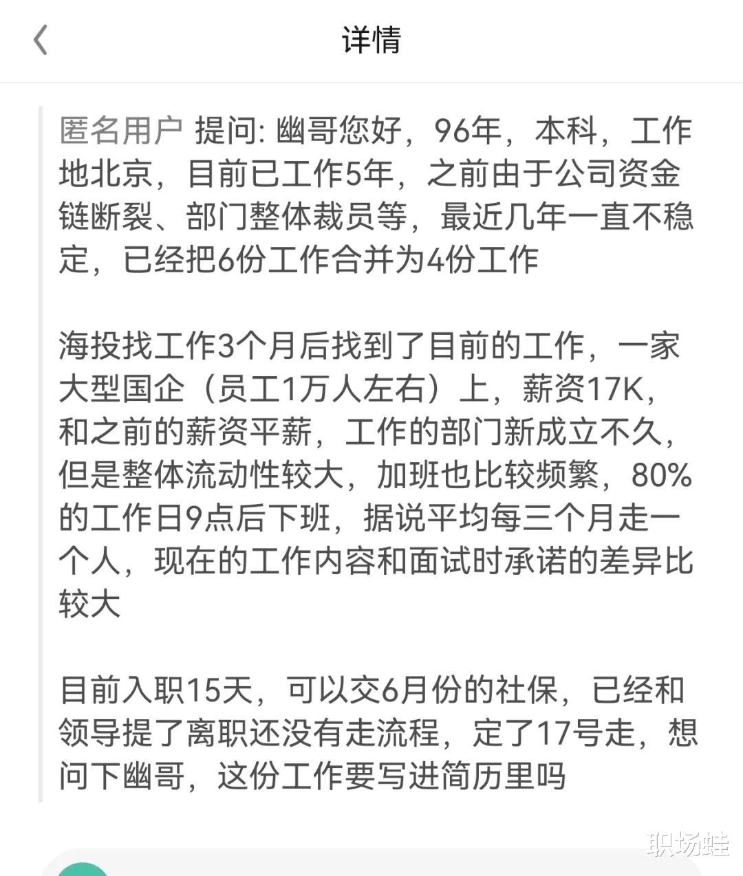 这位也是96年,本科生在北京,海投找工作3个月,大致算拿到一家大型国企的意向,月薪17K,和之前的薪资一样。但好像是国企的创业子公司,所以不算加薪,确实是平薪,因为也可能加班,且人员流动率大。