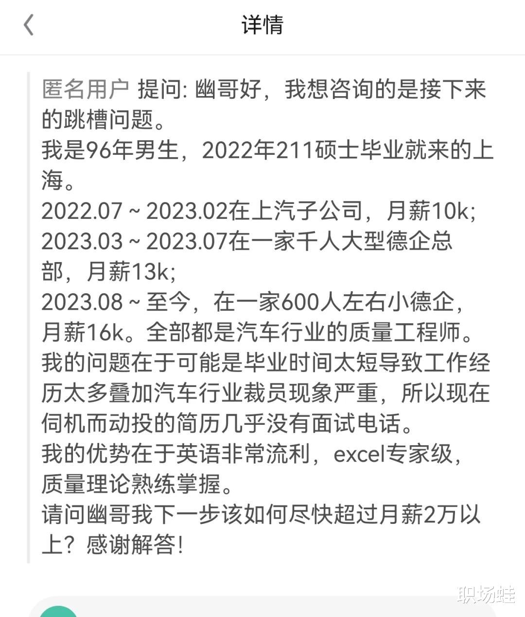 他从国企月薪10k跳到德企总部13k,再跳到目前小德企月薪16k,岗位全都是汽车行业的质量工程师。