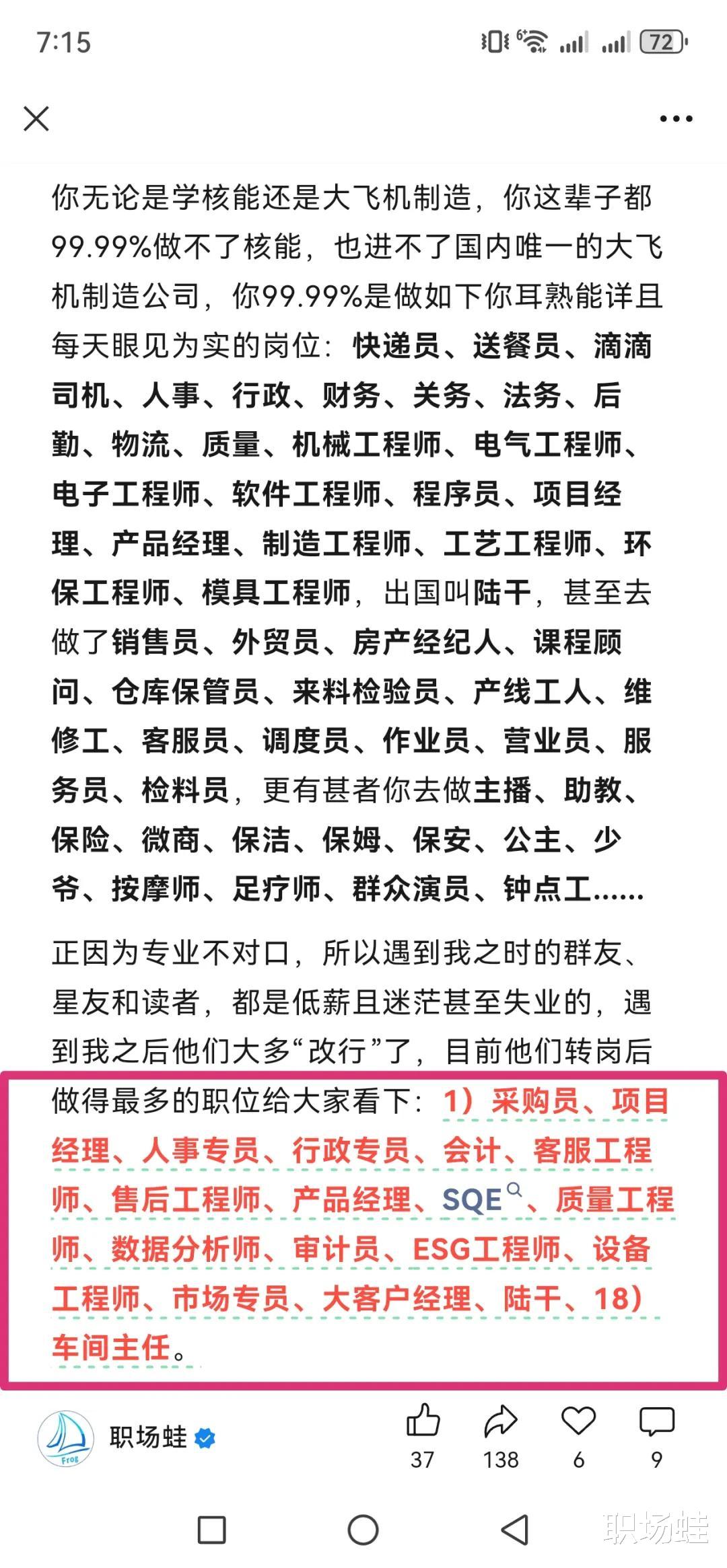 她连简历都不会写,投递方向又不懂。其实常见那18个岗位都可以投递,见下图红色的职位,我都写烂了,原文见《从就业的角度看,该如何填志愿选专业?》。