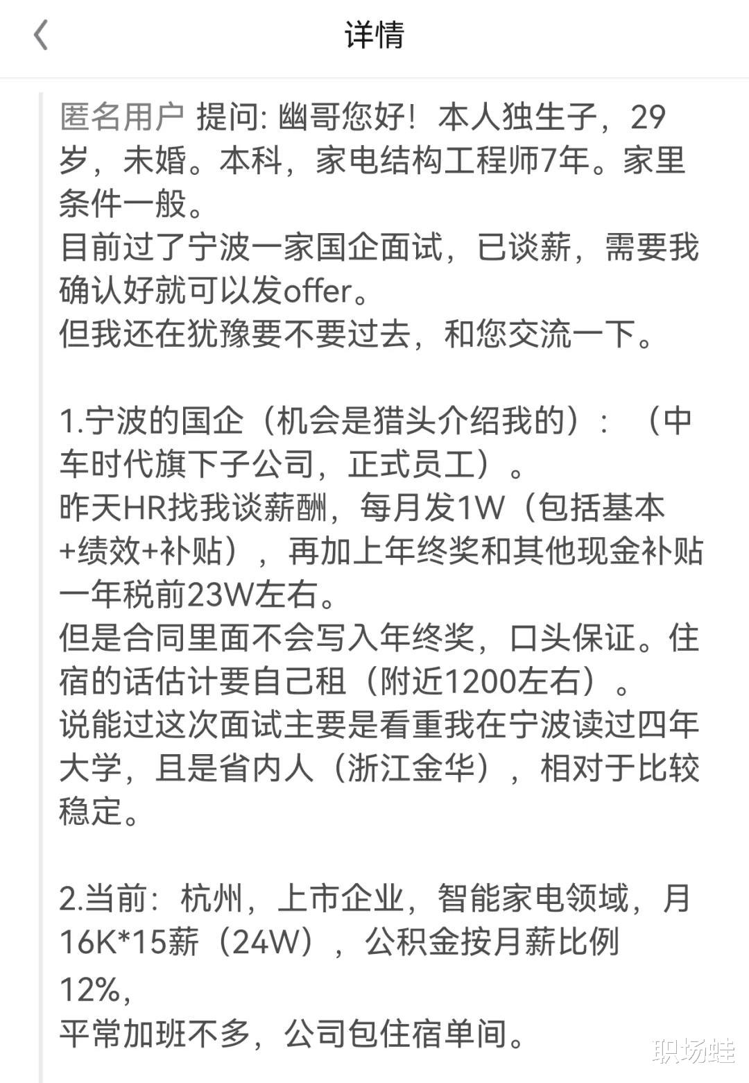 29岁的本科毕业家电结构工程师,有宁波国企的入职意向,每月发1W(包括基本+绩效+补贴),再加上年终奖和其他现金补贴一年税前23W左右。但是合同里面不写年终奖,算口头保证。