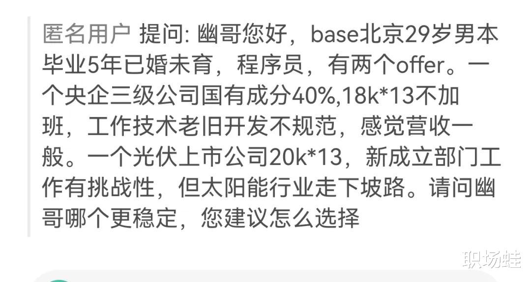 在北京的29岁男孩,本毕业5年已经结婚了,程序员,有两个offer。一个央企三级公司月薪18k。另一个光伏上市公司20k*13薪。