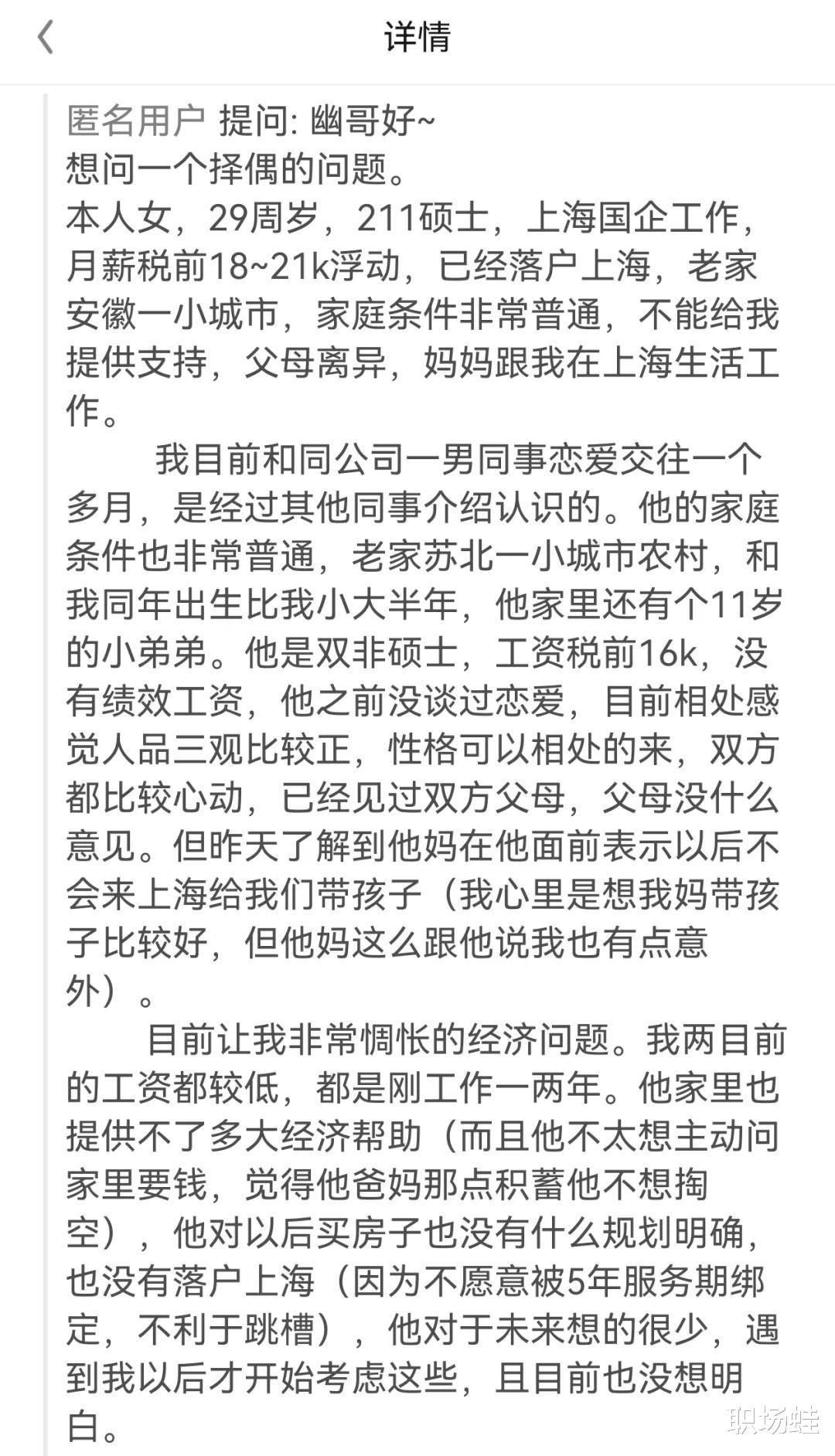 她主要来问婚恋问题的,谈了个29岁同龄的硕士男,正好我们看下工资,也增加一个数据。男朋友是双非硕士在上海,月工资税前16k,没有绩效工资,比女朋友差不多每月低了5千块的样子。
